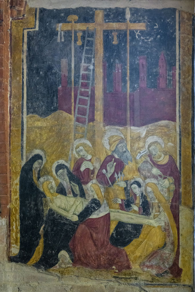 Altri affreschi si susseguono sulla parete della navata sinistra. Innanzi tutto un ciclo dedicato alla morte del Cristo, ove è riscontrabile la mano di pittori diversi, probabilmente ignoti pittori locali della prima metà del XV secolo. A sinistra della finestra ecco la scena della Deposizione, secondo un modello tradizionale del compianto sul Cristo morto: sono riconoscibili la Vergine, dietro di lei S. Giovanni, S. Giuseppe d’Arimatea, Nicodemo, la Maddalena con le Pie Donne. A destra della finestra compare un frammento di Crocifissione di cui restano le figure dolenti della Vergine e di S. Giovanni. Al centro, ai piedi della Croce, il teschio di Adamo, secondo un’iconografia diffusa nella prima metà del secolo in area padana.
