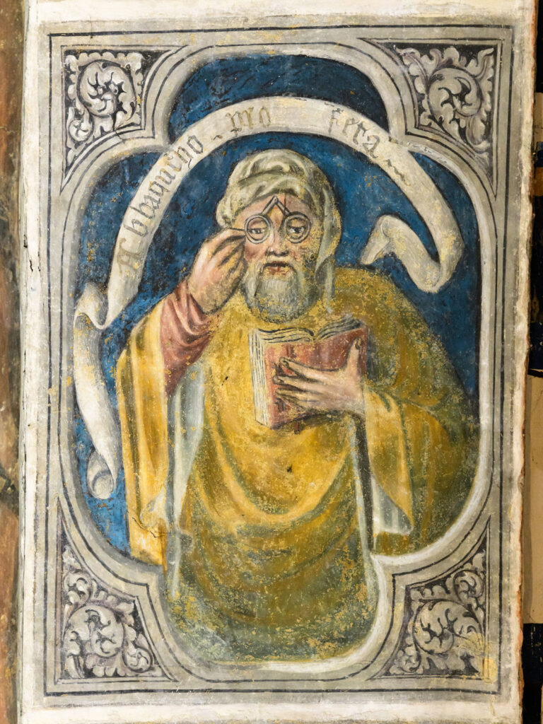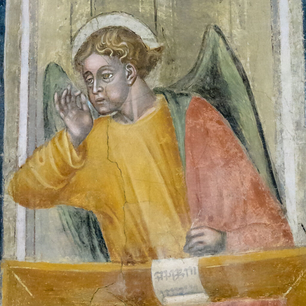 Sempre nell’area presbiteriale, nel sottarco dell’arco trionfale, sono rappresentate dodici figure di patriarchi e profeti: ciascuno porta il suo cartiglio in cui si può leggere il nome: singolare e curiosa appare la figura di Abacuc, con occhiali a pince nez, particolare mai rilevato negli affreschi dell’epoca. Sulla parete di fondo invece è raffigurata l’Annunciazione: l’Arcangelo Gabriele e la Vergine sono posti sotto edicole diverse fra loro. Infine, sulla parete sinistra, entro una bellissima cornice a motivi floreali, una coppia di angeli turibolanti ed un’altra di angeli inginocchiati, in atto di suonare la tromba del giudizio: facevano in origine cortina alla tomba di Jacobino Maggi, distrutta purtroppo in epoca napoleonica. L’attuale colore del fondo, verde malachite, risulta probabilmente per alterazione dell’azzurrite originale. Bellissime le ali degli angeli, elaboratissime e variopinte.