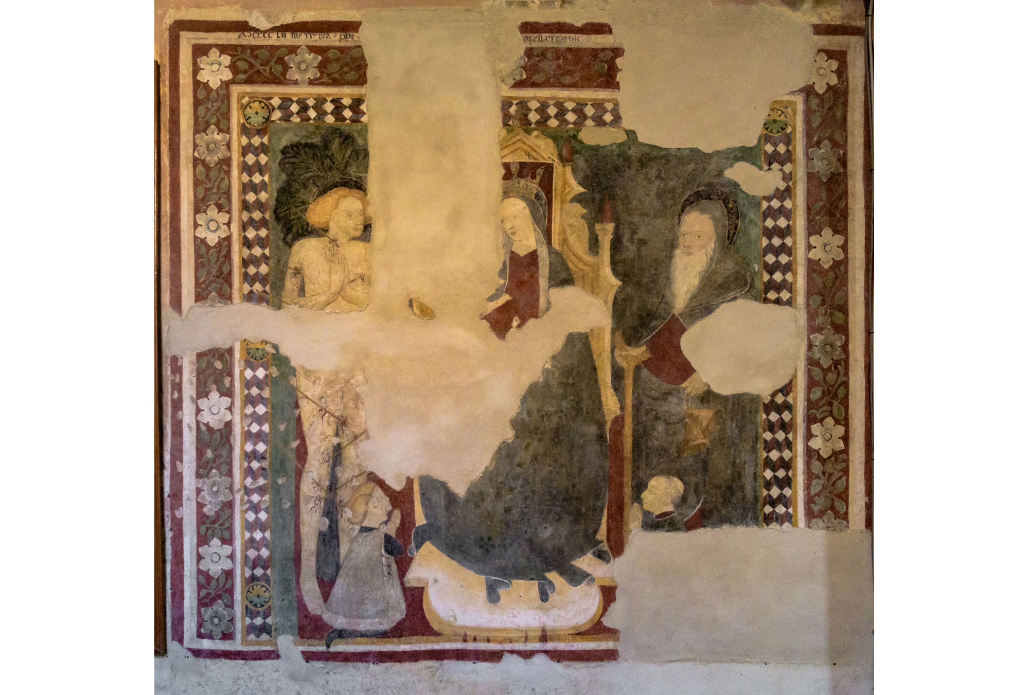 Sulla parete destra interna della cappella compare un affresco di più ampio respiro, purtroppo con ampie lacune: La Madonna con il Bambino tra i Santi Sebastiano e Antonio Abate e committenti raffigurati più in basso, un chierico e due oranti con manto di ermellino. L’opera è datata 1452. La cornice floreale ne ricorda altre analoghe a Cassine e le figure richiamano quelle presenti in affreschi della chiesa di Rivalta. Siamo comunque ancora in clima tardo gotico: i richiami alla cultura locale di metà quattrocento sono molteplici, a cominciare dall’abbigliamento.