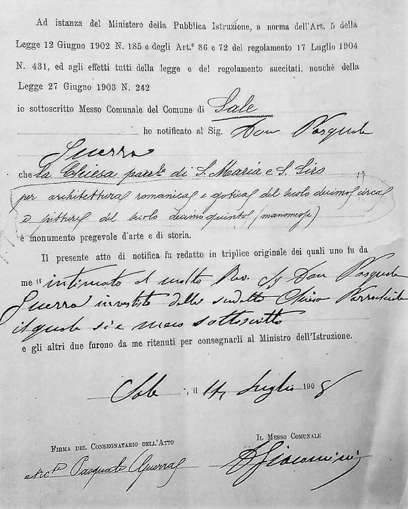 La troviamo comunque già menzionata in documenti del XII e XIII secolo, al centro di importanti avvenimenti: qui si firmò la pace tra Tortona e Pavia il 24 giugno 1165 alla presenza dei consoli delle città e nel 1223 ivi venne siglato un trattato fra il Comune di Tortona e i conti di Langosco e di Sparvara circa i diritti su Cassano. E’ quindi appurato che doveva godere di un notevole “prestigio” politico, riconosciuto in un’area molto vasta tra pavese e tortonese. Va precisato che S. Maria e la pieve di S. Siro appartenevano alla diocesi di Pavia e di fatto rappresentavano, unitamente alla pieve di Bassignana, la testa di ponte pavese oltre Tanaro, alle porte di Tortona. Sale era allora “municipio pavese” e tale rimase sino al 1744 quando, ultimo lembo di terra lombarda, venne ceduto al Piemonte insieme all’Oltrepo pavese. S. Maria verrà invece inglobata nella diocesi tortonese solo nel 1817 durante la Restaurazione.