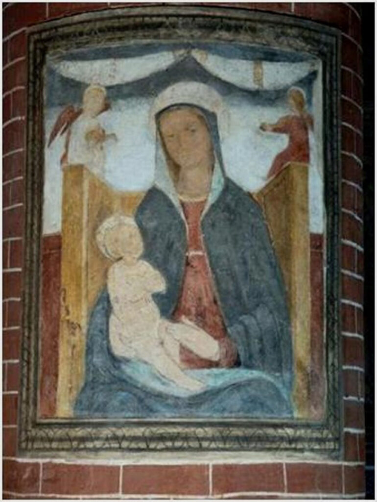 In occasione della prima serata del Maggio Musicale 2025 è stato presentato il restauro della Madonna con il Bambino e due angeli reggicortina, posta sulla quarta colonna della navata destra. Dopo un anno impegnativo che ha visto la conclusione del restauro del Cristo Deposto e la pubblicazione del volume “S. Maria e S. Siro di Sale. La storia, gli affreschi” abbiamo voluto proseguire nel percorso d salvaguardia delle emergenze artistiche presenti nella Chiesa. Perché questo affresco? Per rispondere riprendiamo le parole di Jacopo Tanzi espresse nel volume prima citato “allo stato attuale l’affresco è, complessivamente, in condizioni precarie, ma al di là del problematico stato conservativo la pittura dimostra un disegno saldamente prospettico e di non trascurabile qualità.” Siamo a cavaliere tra il quattrocento e il cinquecento e la cultura di riferimento è quella lombarda, più precisamente pavese con influssi liguri.