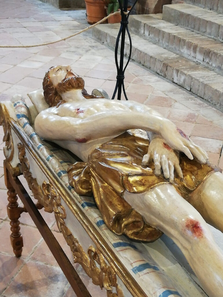 Il fatto che la parte destra del corpo, non visibile ai fedeli, non sia rifinita nell’intaglio come l’altro fianco, fa supporre che la statua fosse stata realizzata per essere collocata stabilmente nella nicchia, e non per essere portata in processione.